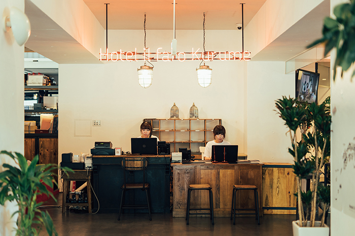 ネオンラインとシックでアンティークな家具をそろえたフロント。笑顔が自慢のスタッフが心を込めて対応いたします。