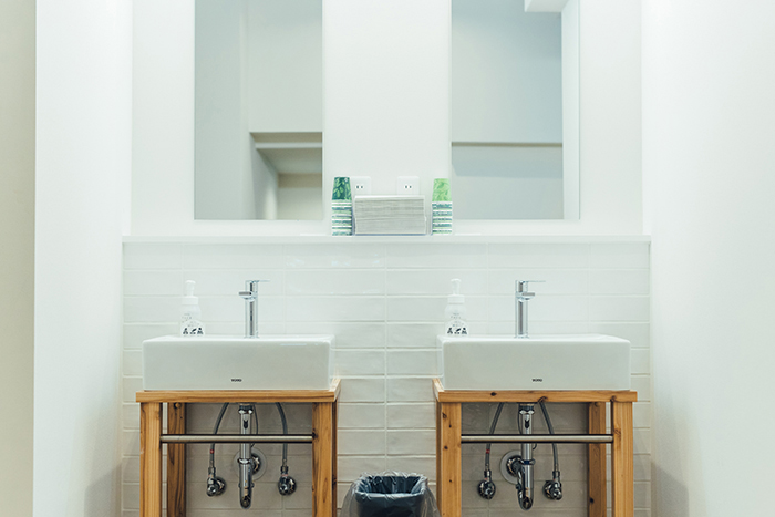 各フロアに洗面台があり、朝早い時間でも人目を気にせずOK。女性フロアにはドライヤーとヘアアイロンも完備しています。